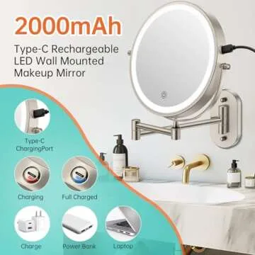 Show more Introducing the Rechargeable Wall Mounted Lighted Makeup Vanity Mirror—a revolutionary mirror designed to enhance your beauty routine and transform your personal grooming experience! Measuring a perfect 8 inches, this double-sided mirror delivers exceptional clarity with its 1X and 10X magnification options. Ideal for makeup application and grooming, this mirror allows you to view yourself in stunning detail. The innovative 360-degree rotation and extended arm ensure you can adjust the mirror to your comfort, making it accessible for both taller and shorter users.