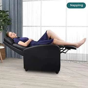 Show moreIntroducing the ultimate relaxation solution - the Recliner Chair designed for comfort, elegance, and functionality. This modern chair beautifully combines PU leather with a sleek black finish, making it a perfect addition to any living room, bedroom, or home theater. Its adjustable reclining capability allows you to effortlessly change between sitting upright, reclining back, or lying flat to accommodate all your needs - whether you're enjoying a movie marathon, taking a rejuvenating nap, or engrossed in your favorite book. Experience luxurious comfort with its thoughtfully designed footrest and high-density sponge filling that ensures exquisite support while you unwind after a long day.