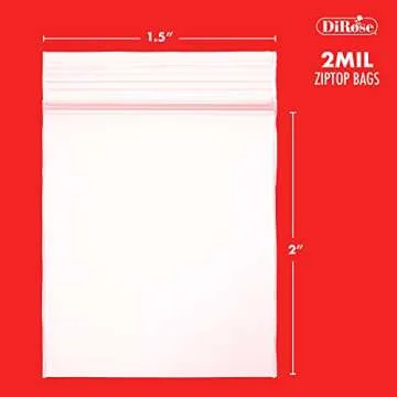 Show moreIntroducing the Reclosable Clear Plastic Zip Bags by DiRose! Engineered to meet a myriad of storage needs, these versatile bags are perfect for organizing, packaging, and shipping. Sized at 1.5 inches wide by 2 inches high, these durable bags boast a robust 2 Mil thickness, ensuring that your items remain secure and safe from moisture. Made from low-density polyethylene (LDPE) and FDA-compliant for food storage, they are ideal for a range of small items—from jewelry and vitamins to coins and candy. A reliable zip lock closure provides an airtight seal, keeping your essentials protected and visible for easy identification.