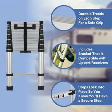 Show moreIntroducing the RecPro RV Telescoping Ladder – your ultimate companion for navigating your recreational vehicle with ease and security. This highly versatile ladder extends to an impressive length of 12.5 feet and boasts a remarkable capacity of 330 pounds, ensuring it meets the demands of any outdoor maintenance or home repair task. Designed specifically for compatibility with Lippert On-The-Go units, it provides the same exceptional functionality at a fraction of the price of similar ladders on the market.