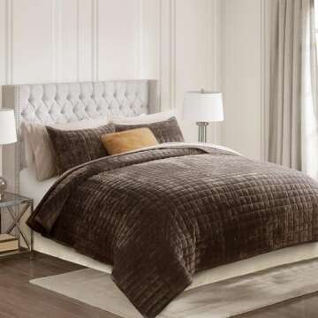 Show more Experience the epitome of luxury and comfort with the RECYCO Luxury Velvet Quilt Set. Crafted for those who appreciate sophistication, this quilt set is more than just a bedding piece; it’s a statement of style. Made from premium velveteen fabric, it offers an ultra-soft texture that invites you to cuddle in for cozy nights. The quilt's elegant walnut brown color showcases a rich, inviting sheen, reflecting different shades depending on the light, thereby creating a truly dynamic look for your bedroom. The classic channel stitch geometric pattern not only adds visual interest but also enhances the overall aesthetic, making it an essential addition to any home decor.