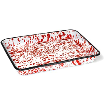 Show moreIntroducing the Red Co. 11" x 9" Enamelware Metal Classic 2 Quart Rectangular Serving Tray, a true masterpiece that seamlessly combines style and functionality. Adorned with a striking red speckled design against a smooth white surface and complemented by a chic black rim, this tray is not only a practical serving solution but also an enchanting decorative piece for your kitchen or dining area. Perfect for those who cherish vintage aesthetics, shabby chic decor, or farmhouse charm, it’s a gift that delights both in utility and visual appeal.