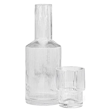 Show moreIntroducing the exquisite Night Carafe and Tumbler Set, a harmony of traditional elegance and modern aesthetics. This beautifully designed carafe features a slim neck and a ribbed pattern, making it a stunning centerpiece whether on your bedside table or dining room. Crafted with thick, durable glass, it ensures your beverages remain fresh and free from contamination.