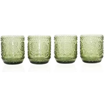 Red Co. Vintage Botanist Drinking Glass Set - Luxurious Floral Embossed Green Glassware for Elegant Entertaining