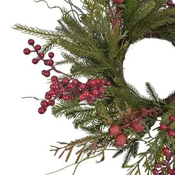 Show more Welcome the holiday season with the stunning RED DECO Christmas Door Wreath, expertly crafted to bring a touch of festive cheer to your home. Measuring 20-22 inches in diameter, this lush and vibrant wreath embraces the spirit of winter with its delightful combination of artificial berries, branches, and leaves that have been thoughtfully arranged for a realistic and eye-catching appearance. Perfect for adorning your front door, this wreath serves as an elegant statement piece that transforms your entrance into a warm and welcoming sight for visiting guests. Whether you are celebrating Thanksgiving, Christmas, or New Year’s, this versatile wreath easily enhances the charm of any occasion.