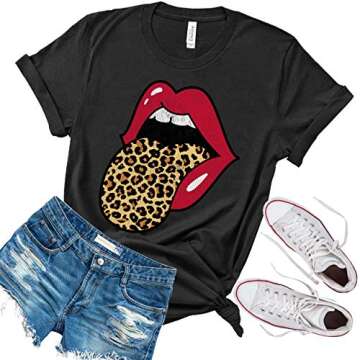 Red Lips Leopard Distressed Print Tongue T-Shirt | Cheetah Animal Print Trendy Graphic Tee | Unisex Sizing (Small, Vintage Black)