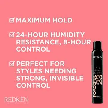 Show moreIntroducing Redken Forceful 23 Super Strength Hairspray, a game-changing finishing spray designed for all hair types. This premium hairspray is crafted to provide the ultimate hold and long-lasting style, ensuring your look remains flawless and vibrant throughout the day. With an impressive 9.8-ounce formula, it not only locks in your style but also enhances your hair's natural shine. Whether you're aiming for sleek sophistication, playful curls, or an effortlessly tousled finish, Redken Forceful 23 has you covered with its enhanced performance.