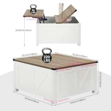 Show more Introducing the Redlife Farmhouse 35" Lift Top Coffee Table—your ultimate combination of functionality, style, and practicality. Designed with modern living in mind, this chic gray square coffee table is not only visually appealing but also highly functional, thanks to its hidden storage space and hydraulic gas lift mechanism. Imagine a table that not only serves as a stunning centerpiece in your living room but also provides ample room to store pillows, blankets, and other essentials, making it a perfect solution for decluttering your space. Quality craftsmanship shines through with a thickened 1.2” premium tabletop that is both waterproof and scratch-proof, catering to families and pet owners alike, ensuring it withstands the test of time while maintaining its beauty.