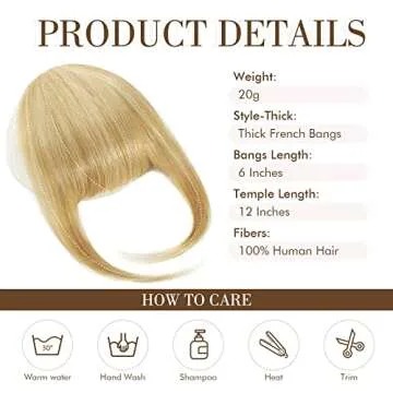 Show moreTransform your hairstyle in an instant with the luxurious REECHO Clip in Bangs. Expertly crafted from 100% Remy human hair, these stunning bangs are designed with a blunt cut full fringe that beautifully frames your face, enhancing your features and giving you a trendy, chic vibe. With a perfect length of 6 inches for the fringe and 12 inches for the feathered sides, you can achieve that voluminous look without the long-term commitment of a haircut. Each set features three secure pressure-sensitive clips that keep your bangs firmly in place, ensuring you feel confident all day long.