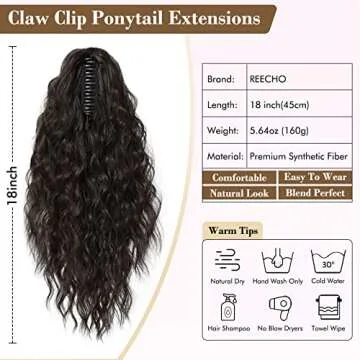 REECHO Ponytail Extension, 18 Inch Claw Clip on Ponytail Extension for Women Long Curly Wavy Hair Extensions Natural Fluffy Synthetic Clip in Ponytail Hairpiece for Daily HP002 - Black Brown