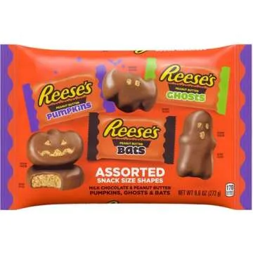 Show moreREESE'S Assorted Milk Chocolate Peanut Butter Snack Size Shapes Candy is the perfect treat for any Halloween festivities! With a delightful mix of REESE'S famous Milk Chocolate and creamy Peanut Butter, this 9.6-ounce variety bag is filled with everyone's favorite spooky shapes, including Pumpkins, Ghosts, and Bats. Each candy is individually wrapped, ensuring they stay fresh and enticing, making them a great addition for trick-or-treaters, Halloween parties, or simply to satisfy your cravings during movie nights. The Halloween-themed packaging adds a fun touch that makes these treats not only delicious but visually appealing, making it an ideal choice for sharing and decorating.