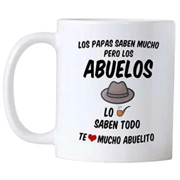 Show more Discover the perfect blend of humor and practicality with our 11 oz Ceramic Novelty Coffee Mug. Featuring the witty phrase, 'Los Papas Saben Mucho pero los Abuelos lo Saben Todo', this mug is designed to bring a smile to anyone's face. Crafted with care, the mug showcases a unique design printed on both sides, making it the ideal companion for coffee, tea, or any favorite hot beverage. Built to last, it is dishwasher (top rack) and microwave safe, ensuring it withstands the rigors of everyday use. With a height of 4.75 inches, a width of 3.13 inches, and depth of 3.75 inches, it holds just the right amount of liquid to kickstart your morning or keep you energized throughout the day.