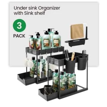 Regoia Under Sink Organizer and Storage 2 Pack with 1 Sponge Holder for Kitchen Sink, 2-Tier Sliding Bathroom Organizers and Storage, Kitchen Countertop Organization with Hooks and Hanging Cup, Black