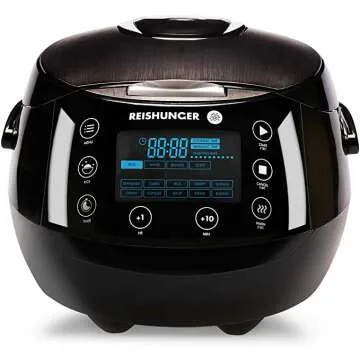 Show moreThe Reishunger Digital Rice Cooker and Steamer in black is a fusion of style and functionality, perfect for any modern kitchen. This multi-cooker boasts a capacity of up to 8 cups, ensuring you can prepare meals for one to eight people with ease. The premium inner pot ensures even cooking every time, whether you're making brown rice, soups, grains, oatmeal, or more. The intuitive design and 12 programmable settings, enhanced with 7-phase technology, make meal preparation a breeze, allowing you to deliver fluffy, perfectly cooked rice consistently.