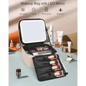 Show moreIntroducing the Relavel Makeup Bag with Light Up Mirror, your perfect partner for every beauty endeavor. This stylish yet highly functional makeup bag is designed to elevate your beauty routine to new heights. Featuring a built-in rechargeable lighted mirror with three adjustable light settings—white, warm, and cold light—this innovative design allows you to customize your lighting for any setting, whether you are at home or traveling. Simply short press to switch colors and long press to adjust brightness for optimal visibility during application.