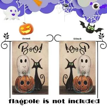 Show moreTransform your outdoor space into a spooky paradise with the RELIGES Halloween Ghost Cat Boo Garden Flag. This adorable mini garden flag, measuring 12 x 18 inches, is perfect for adding a whimsical and festive touch to your lawn, patio, or garden. Crafted from high-quality 100% premium 2-layer burlap, this flag is not only charming but also designed to withstand the elements. Its double-sided design features a vibrant assortment of Halloween favorites, including delightful ghosts, playful cats, and classic pumpkins that ensure your decor stands out from both sides.