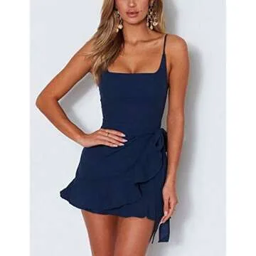 Show moreIntroducing the Relipop Women's Spaghetti Strap Waist Tie Knot Wrap Front Ruffle Hem Short Dress in a stunning Navy Blue. This eye-catching summer dress combines a flirty design with a feminine touch, ensuring you're ready for any occasion. Crafted from high-quality polyester, this lightweight and breathable dress allows for easy movement and comfort throughout your day. Featuring a square neckline and adjustable spaghetti straps, it offers a personalized fit for every body type. The waist tie accentuates your silhouette while the ruffle hem adds a playful twist, making this dress a must-have for your summer wardrobe.