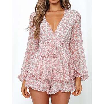 Relipop Women's Polka Dot Jumpsuits Deep V-Neck Long Sleeve Knot Front Ruffle Hem Floral Rompers