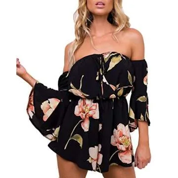 Relipop Women's Summer Floral Off shoulder 3 4 Sleeves Romper Jumpsuit (Large, Black)