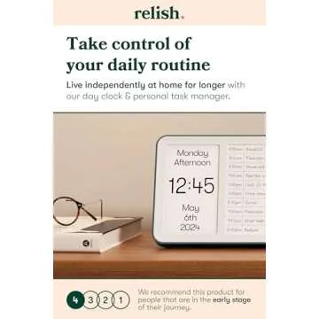 Show more Introducing the Relish Day Hub, an innovative solution designed to enhance the quality of life for individuals living with dementia or Alzheimer’s. This remarkable device is more than just a clock; it’s a caring companion that empowers users to take control of their daily routines, promoting independence and reducing anxiety. With its intuitive card panel, users can easily jot down their daily tasks, providing a gentle structure to their day that is incredibly beneficial for those who may struggle with memory challenges.