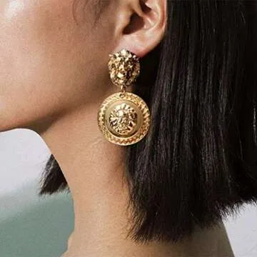 RELOVET Lion Head Earrings Vintage Statement Golden Coin Women Fashion (gold)