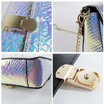 Show moreThis vibrant and trendy hologram crossbody bag is a must-have accessory for anyone looking to elevate their style. Crafted from high-quality PU leather, this bag not only offers a modern aesthetic but is also waterproof, making it perfect for various weather conditions. The bag features a detachable chain approximately 115cm/45 inches, providing versatility in carrying options. Its magnetic snap closure ensures easy access while also keeping your belongings secure.