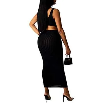 Remelon Womens Summer Sleeveless Solid Color Ribbed Tank Crop Top Bodycon Tie Skirts Set 2 Piece Midi Dress Outfits Black L