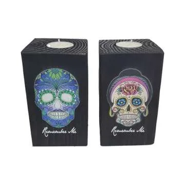 Show moreIntroducing our unique Remember Me Celebration Candle Holders for Day of The Dead—a heartfelt tribute designed to honor and remember loved ones who have departed. This stunning set of two candle holders is meticulously crafted, showcasing intricate details that reflect the beauty and significance of the Dia de los Muertos celebration. Standing tall at 6 inches, these candle holders feature vibrant blue and green skull designs accented with beautifully printed pink roses, making them not only functional but also an aesthetically pleasing addition to your altar.