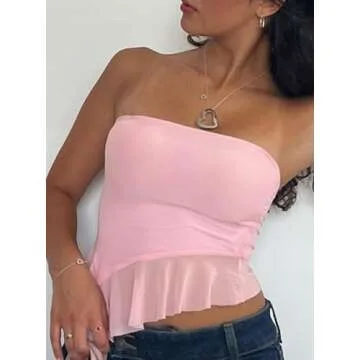Remidoo Women's Ruffle Asymmetrical Hem Crop Tops Sexy Sheer Mesh Strapless Tube Top Pink Small