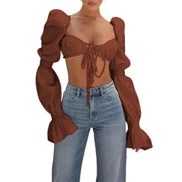Show moreThe Remidoo Women’s Sexy Self Tie Front Ruched Puff Long Sleeve Crop Top Blouse in a luxurious brown hue is a stunning addition to any fashion-forward wardrobe. Designed for the modern woman who loves to express her style, this blouse features a chic self-tie front that accentuates your silhouette beautifully. The ruched detailing adds texture and elegance, making this top a versatile piece suitable for day or evening wear. Crafted with high-quality materials, it offers comfort without compromising style, ensuring you look and feel your best regardless of the occasion.