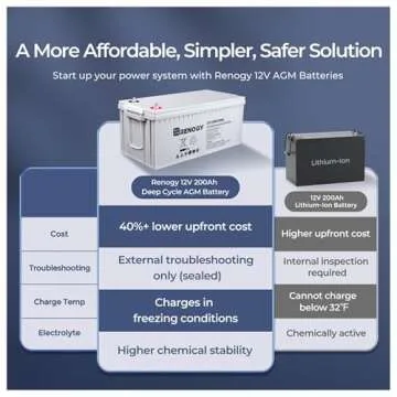 Show moreIntroducing the Renogy Deep Cycle AGM Battery 12 Volt 200Ah, a premium power solution designed for efficiency and reliability. With innovative technologies such as thick absorbent Glass Mat (AGM) separators and advanced valve regulated systems, this battery is engineered to withstand the rigors of daily use without the hassle of frequent maintenance. Say goodbye to acid leakage and heavy upkeep; with a low self-discharge rate of just 3% at 77℉ (25℃), this long-lasting battery is perfect for a variety of applications, including RVs, camping, cabins, marine activities, and off-grid systems.