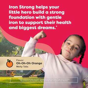 Infused with carbonyl iron to minimize stomach upset, and fortified with Vitamin C, which plays a critical role in iron absorption, Renzo's Iron Strong melty tablets are tummy-friendly and effective. These vitamins come in a delicious orange flavor that kids adore, ensuring that they’ll look forward to their daily dose of goodness.