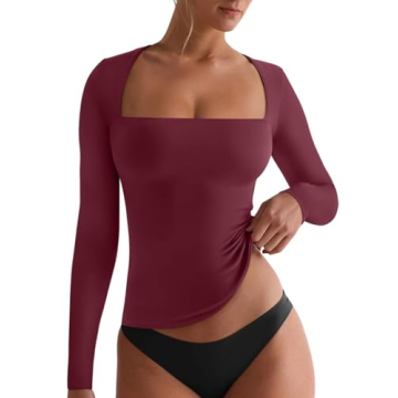 REORIA Sexy Square Neck Tops for Women - Fall Basic Long Sleeve Shirt - Dark Red - Small