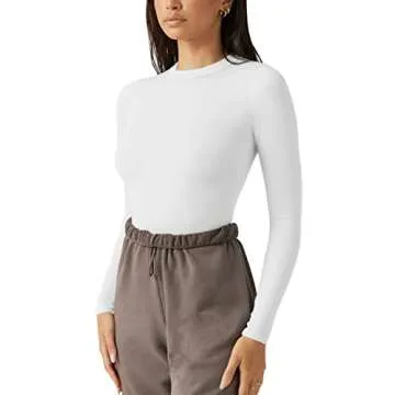 REORIA Women's Fall Fashion Crew Neck Double Lined Long Sleeve One Piece Fitted Tight T Shirts Leotards Bodysuits Tops For Going Ou White Large