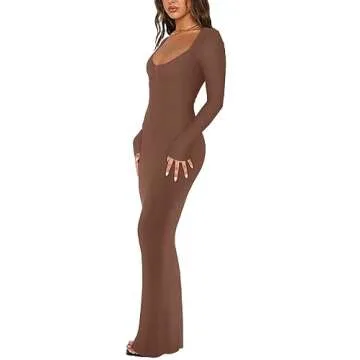REORIA Women's Sexy Casual V Neck Long Sleeve Lounge Long Dress Elegant Fall Wedding Guest Tight Ribbed Bodycon Maxi Dresses Coffee X-Small