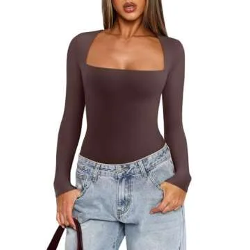 REORIA Womens Sexy Long Sleeve Square Neck Lightweight Double Lined Basic Layering Slim Soft Leotards Shirts Fall Going Out Bodysuit Tops Cocoa Small