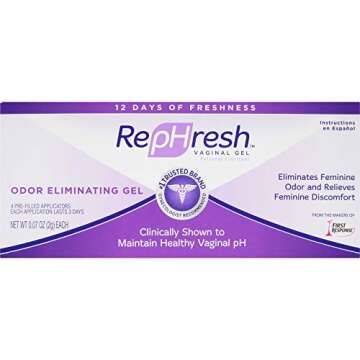 Show moreIntroducing the Rephresh Vaginal Gel, a revolutionary solution designed specifically for women’s intimate health. As a leading choice in feminine hygiene, this product is clinically proven to maintain a healthy vaginal pH and eliminate uncomfortable odors without disrupting your body's natural balance. Each application is easy and mess-free, thanks to the convenient prefilled applicators, with one lasting up to three days. Whether it's hormonal fluctuations during your menstrual cycle or changes related to menopause, this gel is here to provide relief when you need it the most. Trust in the #1 recommended brand by gynecologists to help you feel fresh, confident, and comfortable every day.