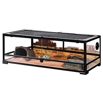 Show moreDiscover the REPTI ZOO Full Glass 35 Gallon Reptile Tank, a meticulously designed terrarium tailored to cater to the needs of your beloved reptiles and amphibians. Measuring 36" x 18" x 12", this tank provides a spacious environment for lizards, geckos, tortoises, snakes, and more, ensuring they have enough room to thrive. Made from high-quality tempered glass, it offers durability and a full-view design, allowing you to interact with your pets easily. Equipped with top screen ventilation, it promotes airflow while permitting UVB and infrared penetration, creating a comfortable habitat. With a thoughtful patented design, this tank stands out in both functionality and aesthetic appeal.