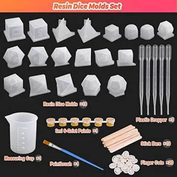Show more Unveiling the ultimate crafting experience with the Shynek Resin Dice Molds Set, your all-in-one solution for creating stunning, personalized polyhedral dice! This comprehensive set includes 19 assorted silicone dice molds tailored for various tabletop games, ensuring you have all the shapes you need to enhance your gaming experience. Accompanied by essential crafting tools like 5 plastic droppers, a 100 ml measuring cup, a set of 6 gold acrylic paints, and a paintbrush, it’s never been easier to unleash your creativity!