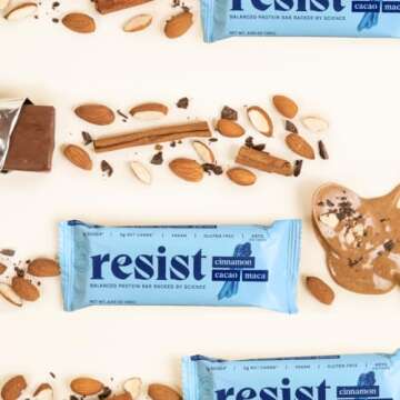 Resist Low Glycemic Protein and Fiber Bars - Cinnamon Cacao Maca | Clinically-Backed, Keto Vegan Bars, Low Sugar, Gluten-Free, Low Carb, No Stevia, No Sugar Alcohols (58g, 12 Count)