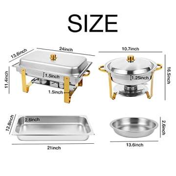 - Complete Chafer Set: Includes everything you need with 2 round and 2 rectangular sets, each with a water pan, food pan, detachable frame, lid, and fuel holder.