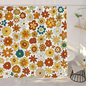 Retro Boho Floral Shower Curtain Set, Funky Vintage 70s 60S Flowers Shower Curtains Bathroom Include Hooks 72" Wx72 H,Trippy Geometric Hippie Abstract Fabric Farmhouse Shower Curtain Yellow Orange