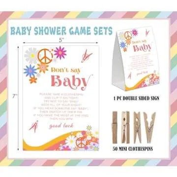 Show moreTransform your baby shower into an unforgettable experience with the Retro Groovy Don't Say Baby Game. This entertaining game is designed to inspire friendly competition among family and friends, creating a lively atmosphere filled with laughter and joy. With a charming 5" x 7" sign that showcases a trendy boho floral daisy design, this game adds a delightful touch to your event decor while engaging guests in a delightful activity. Our package includes 50 high-quality mini natural clothespins, ensuring you have everything you need for a hassle-free setup. Get ready to create lasting memories!