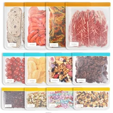 Show more Introducing the SODPE 12 Pack Reusable Food Storage Bags, the ideal solution for eco-conscious individuals looking to enhance their food storage game! Each set contains 4 large lunch bags, 4 reusable sandwich bags, and 4 snack bags, all expertly crafted from food-grade PEVA material. These bags are not only environmentally friendly but also engineered with advanced sealing technology that guarantees an airtight, leak-proof experience for all your food storage needs.