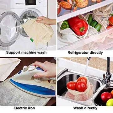 Reusable Produce Bags, Organic Cotton Mesh Bags Muslin Bags with Drawstring Bonus Reusable Grocery Bag for Shopping & Storage, Washable, Biodegradable, Tare Weight on Color Tag(8 Pack)
