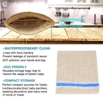 Show moreIntroducing our Reusable Sandwich Bags that are perfect for an eco-conscious lifestyle while ensuring your food stays fresh and protected! This pack includes 10 unbleached cotton burlap bags featuring a charming blue stripes design, combining functionality and style. Each bag is greaseproof and moistureproof, making them an ideal choice for packing sandwiches, snacks, and meals for your travels, lunches, or picnics. With self-adhesive hook and loop closures, these bags are easy to use and maintain, ensuring your food remains secure without the need for single-use plastic.