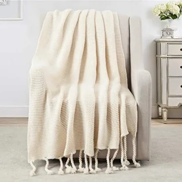 Show more Revdomfly Beige Throw Blanket is the epitome of comfort and style, expertly crafted to enhance your living space. This knitted throw blanket features delightful fringe tassels that lend an exquisite touch to its design, draping beautifully over your couch, bed, or chair. Measuring at 51.2" x 67", it provides ample coverage for snuggling on chilly evenings or accentuating your home decor. Whether you are enjoying a cozy night in or looking to add a chic statement piece to your setup, this throw blanket is the perfect choice.