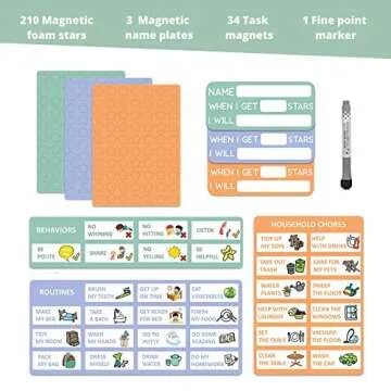 With a vibrant design and thoughtful features, this dry erase magnetic reward chart is an ideal companion in your parenting toolkit. It includes 34 task magnets, 210 colorful stars, and 3 name plates, allowing kids to personalize their experience by assigning their tasks and tracking their progress. The bonus marker gives them the freedom to create custom activities that can easily be adjusted as they grow.
