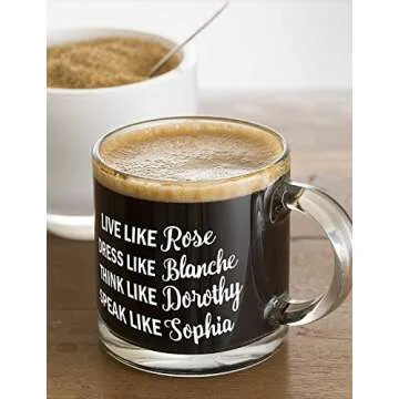 Indulge in a cup of nostalgia with the Reyiu Funny Golden Girls Mug, a delightful 13oz coffee mug that celebrates the iconic sitcom, "The Golden Girls." This charming mug features catchy phrases like "Live Like Rose, Dress Like Blanche, Think Like Dorothy, Speak Like Sophia," making it the perfect gift for fans of the show. Crafted with high-quality materials, it not only brings smiles and warmth but also adds a touch of whimsy to your everyday coffee routine. Its clear design and well-printed...