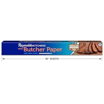Show moreTransform your cooking game with the Reynolds Kitchens Butcher Paper for Smoking Meat. This premium-quality butcher paper comes with a generous 225 square foot roll, making it ideal for any meat-lover's culinary adventures. Engineered for ultimate functionality, its built-in slide cutter simplifies usage, ensuring that every cut is clean and hassle-free. Whether you’re wrapping brisket, ribs, or any other delicious cuts, this butcher paper is crafted to withstand the rigors of smoking while sealing in moisture and flavor. Perfectly pink and FDA compliant, it can endure high temperatures of up to 300°F without compromising your food’s integrity. Say goodbye to leaks and tears—this strong, unbleached, and unwaxed paper guarantees durability you can trust.